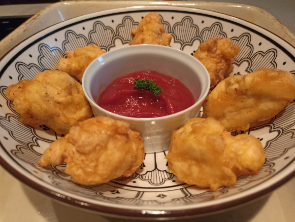 Nuggets de poulet sauce ketchup, tagliatelles de légumes